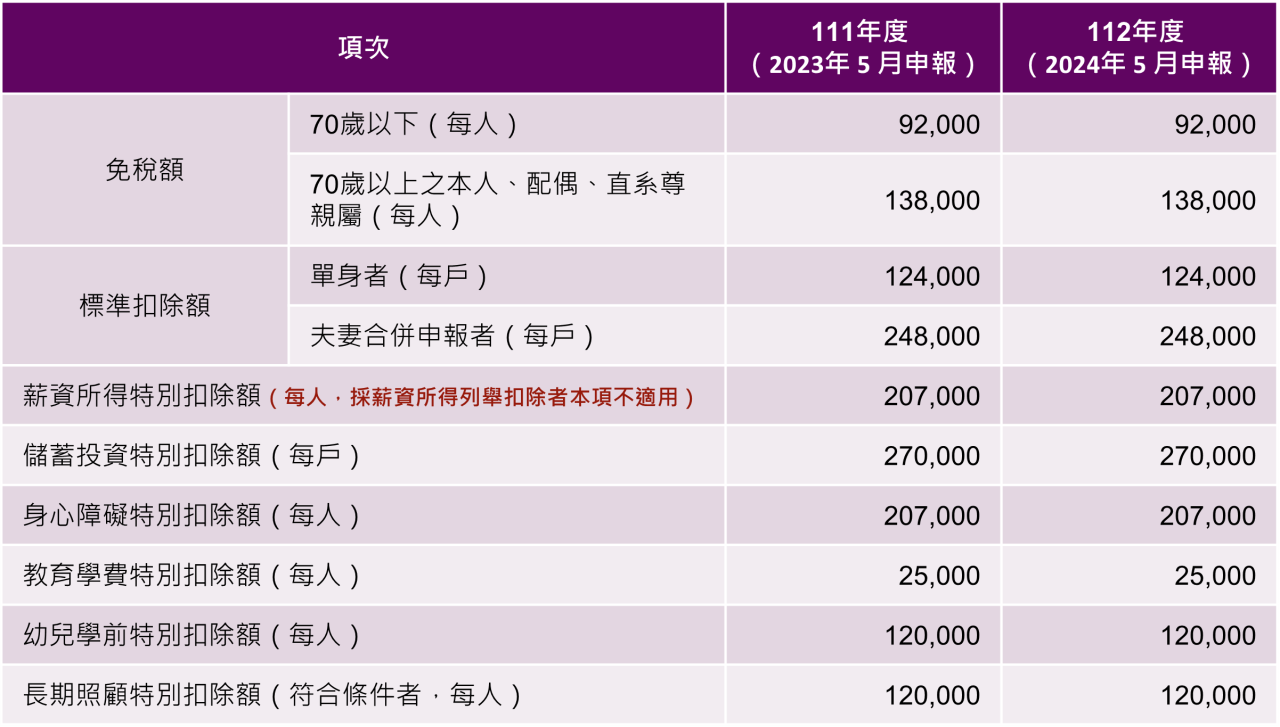 根據財政部111年12月21日公告,112年度申報綜合所得稅之免稅額、標準扣除額、薪資所得特別扣除額、身心障礙特別扣除額、課稅級距及計算退職所得定額免稅之金額,因未達應調整標準,爰免予調整,適用於113年5月辦理112年度所得稅結算申報。(上次調整年度為111年度)