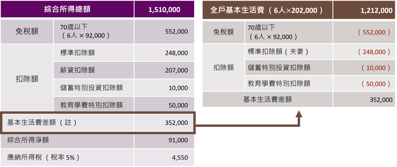 註:基本生活費差額計算,依據納稅者權利保護法施行細則第三條基本生活所需費用之扣除額不包括財產交易損失及薪資所得特別扣除額。