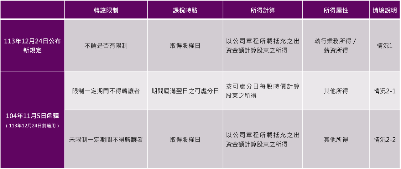 上述規定未發布前,依財政部104年11月5日函釋規定,個人透過勞務取得公司股份時,認屬其他所得。如該股權依公司章程規定於一定期間內不得轉讓者,應以限制期間屆滿翌日之可處分日每股時價計算股東之所得;如未限制一定期間不得轉讓者,應以取得股權日為可處分日,以公司章程所載抵充之金額,計算股東之所得,依法課徵所得稅。