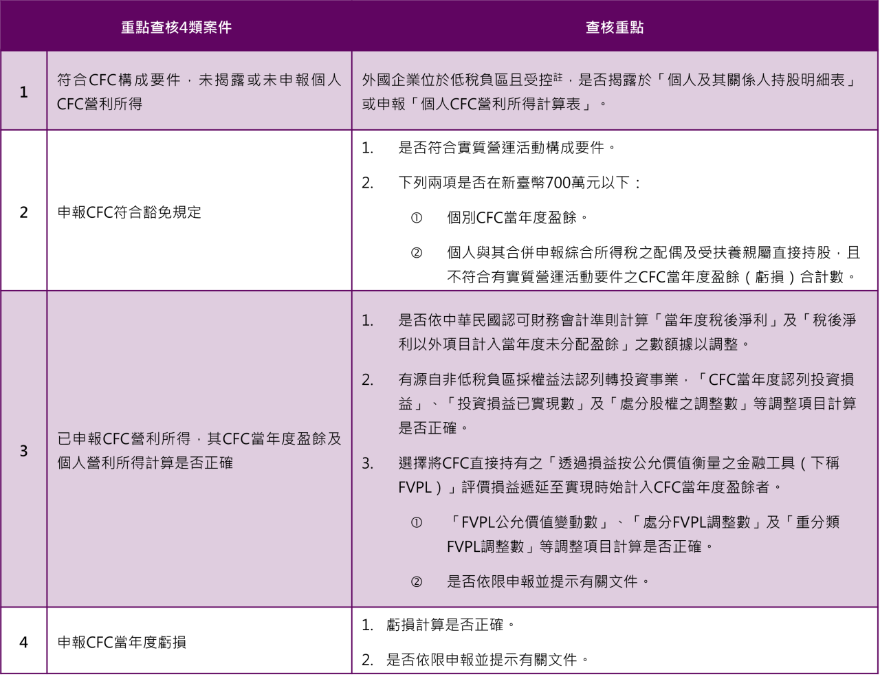 有境外公司的投資人請注意,國稅局近期將對112年度個人CFC已申報案件啟動查核作業,重點查核4類案件如以下彙整表。